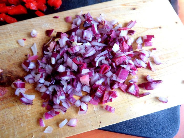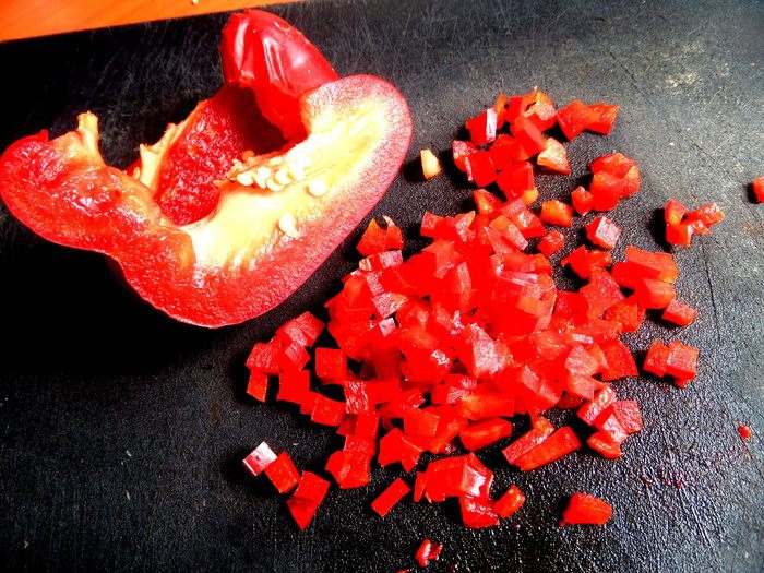 Сладкий перец отлично подходит ко всему составу (можно сухой в порошке),возьмём дольку,тоже мелко покрошим.