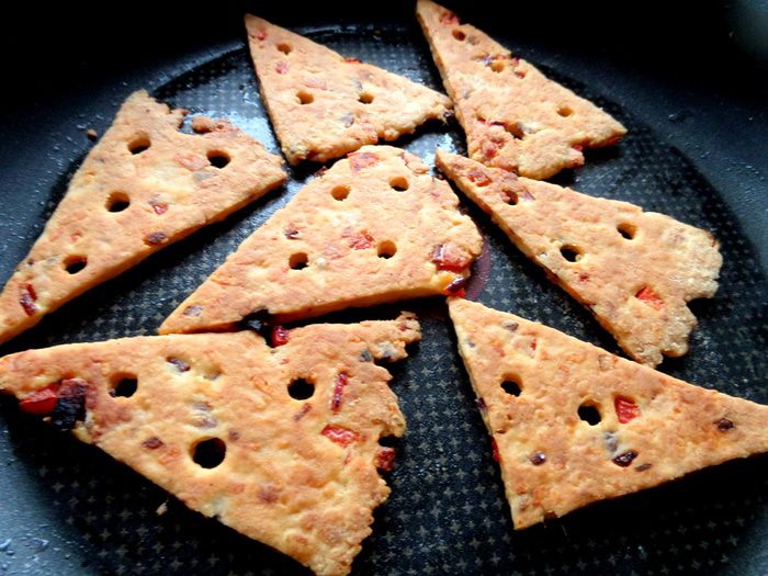 Выкладываем треугольники в смазанную слегка непригораемую форму и печём минут 5-7 в разогретой до 190* духовке.