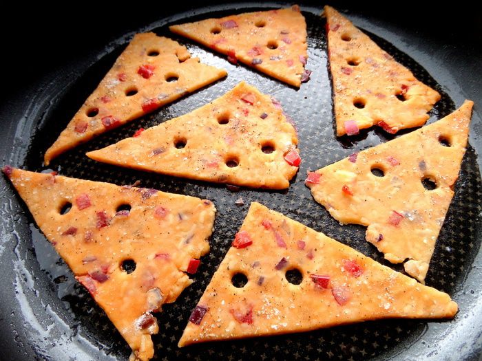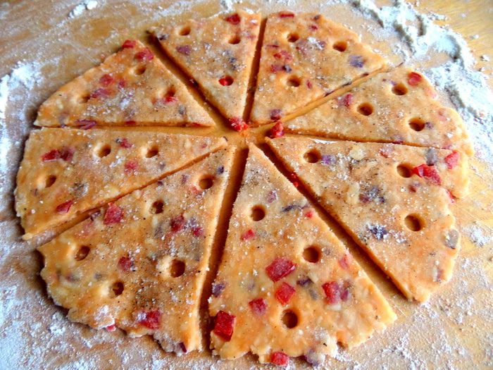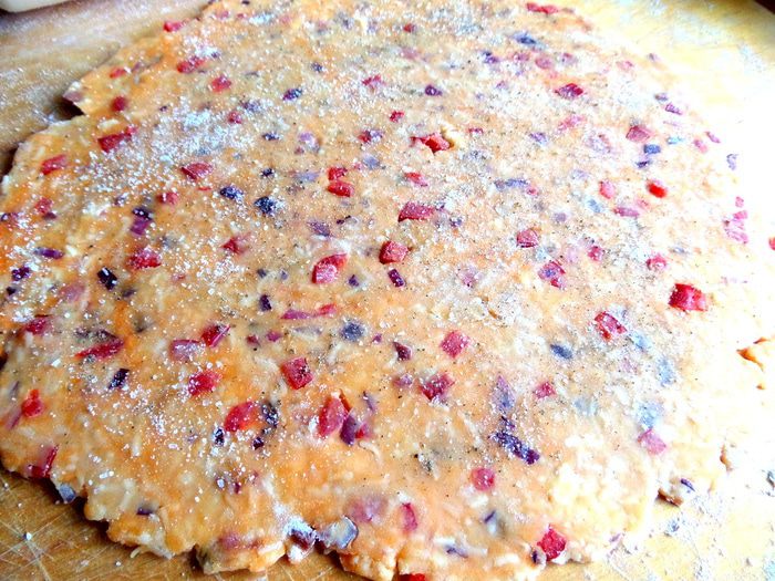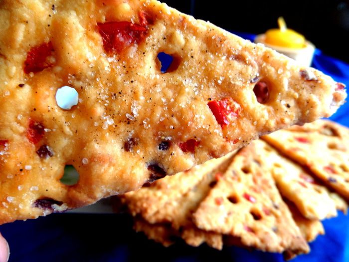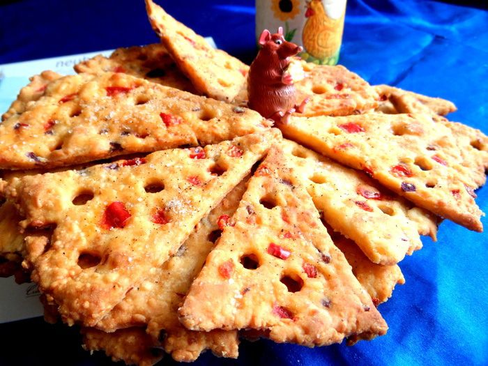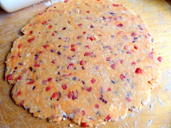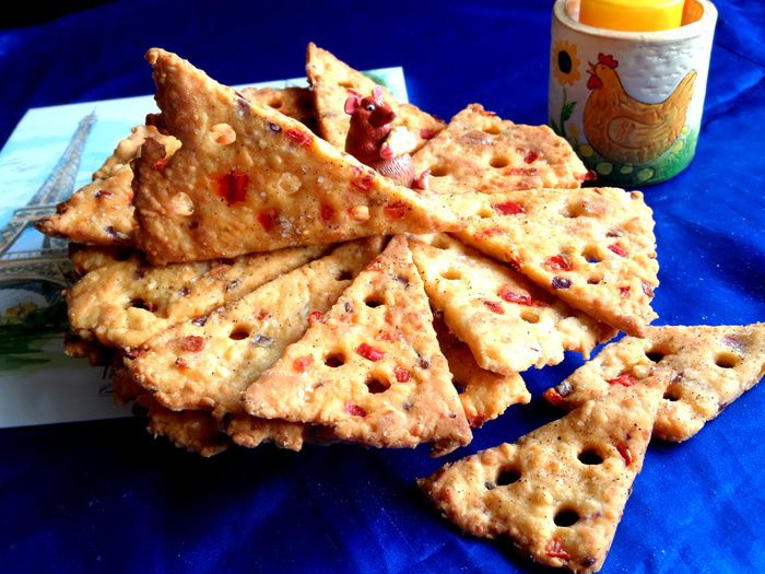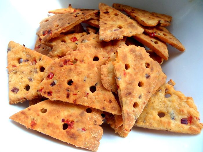 Крекер-универсальное печенье, в тесто-основу можно добавлять уйму всего! Но нам нравится особенно несладкий пикантный вариант с солью и перцем, а кроме того добавим для аромата лук,салями и сладкий перец))) Всё это можно добавить и в сушёном виде: паприку,лук...,тогда муки возьмём меньше, но у меня добавлено всё в сочном натуральном виде, поэтому грамм на 30 муки моё тесто взяло больше! Пекутся крекеры почти мгновенно,главное-раскатать тонко и подсушить подсушить в духовке))) И ещё: сколько бы Вы не напекли этих хрустяшек,их всегда будет мало))) ...,ну я вас предупредила!!!!