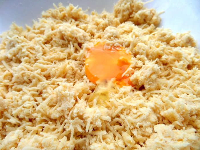 Желток отделяем от белка. Белок я соединила с тёртым сыром и пожарила (тоже в духовке!) горячие бутерброды сыну на работу)))
