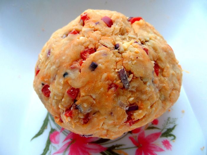 Берём толстую соломинку и прокручиваем дырочки в тесте,имитирую дырки в сыре))))