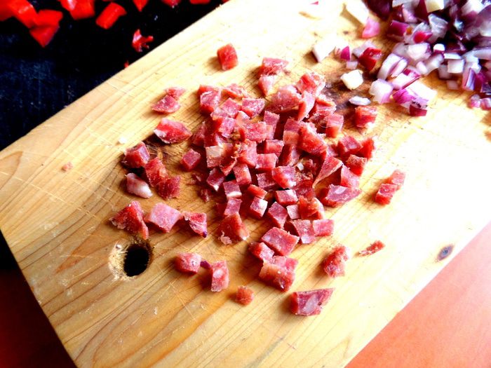 Салями совсем чуть-чуть,2 кружочка измельчим для придания копчёного аромата)))