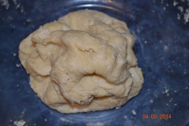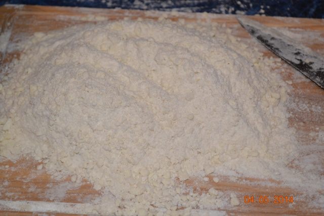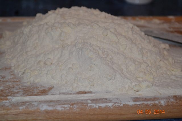 И вот сейчас попробую правильно описать, как нужно делать дальше: опускаете ладонь в муку, поднимаете над миской муку в ладонях, сколько захватили, сжимаете ладонь и отпускаете в тесто, дав ей упасть в миску. И так продолжаете, постепенно вводя остальную воду. И ни в коем случае не месить руками.