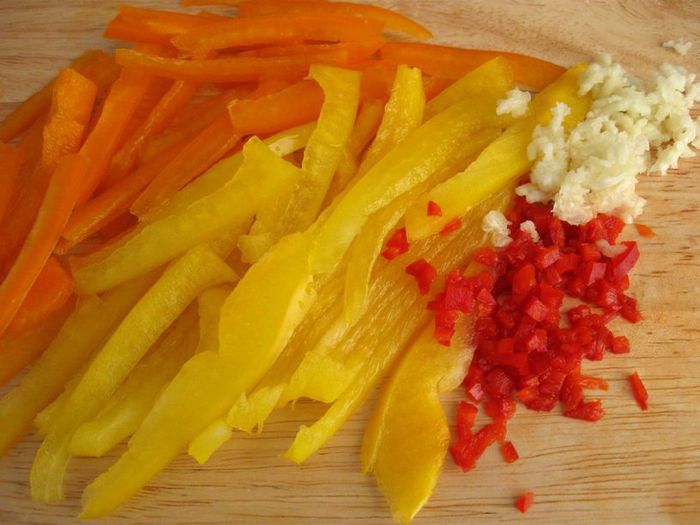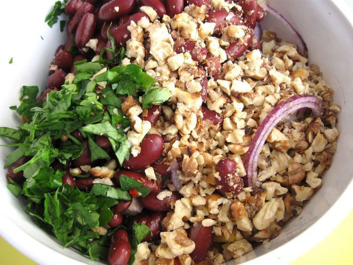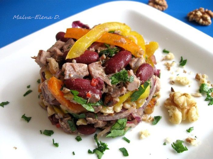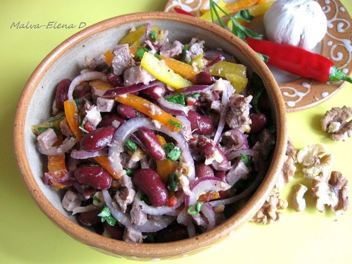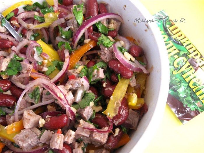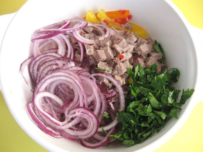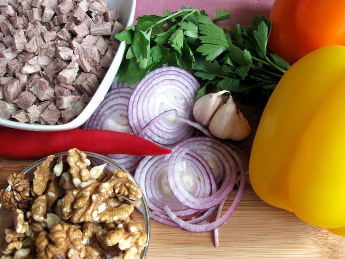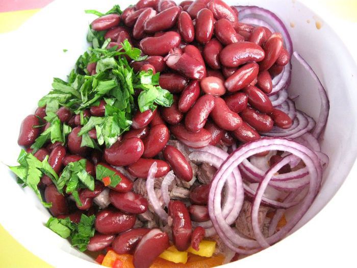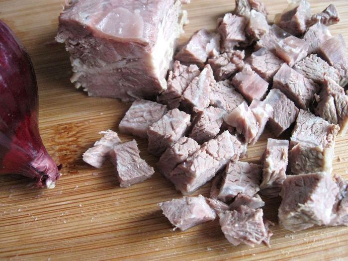 Накануне сварить говядину (хорошо подойдет реберная часть), охладить при комнатной температуре, оставить до следующего дня. Бульон вам пригодится для другого блюда, в салате будет использовано отварное мясо. Вам потребуется 160 грамм отварного мяса. Снять мясо с кости, срезать жир, пленки, порезать кубиками.