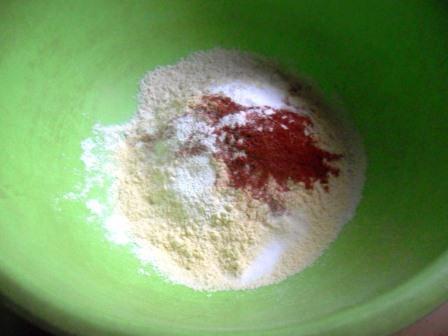 Смешать кукурузную и пшеничную муку, соль, соду, разрыхлитель, паприку и красный острый перец.