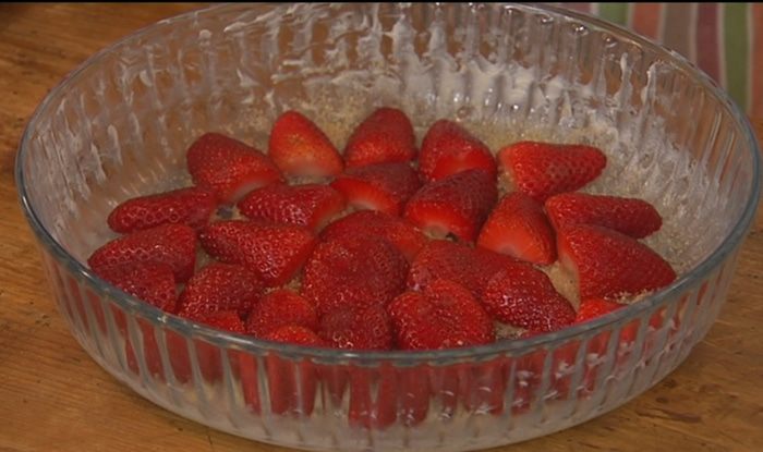 Жаропрочную стеклянную или керамическую форму смазать сливочным маслом, присыпать дно сахаром и выложить клубнику срезами вниз.