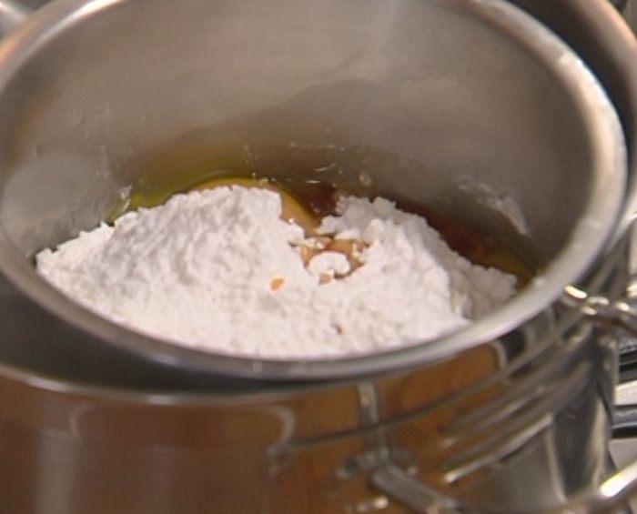 Сахарную пудру соединить с желтками в небольшой кастрюле, добавить ванильный экстракт.