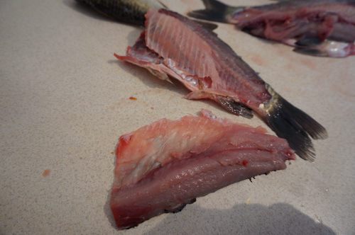 ...отделить филе. И не переживайте, что в первый раз останется больше рыбного мяса на хребте, попрактиковавшись вы будете хорошо срезать филе с рыбы.