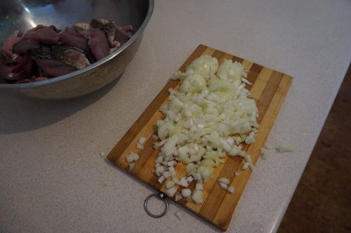 Измельчить лук, пережарить до золотистого цвета.