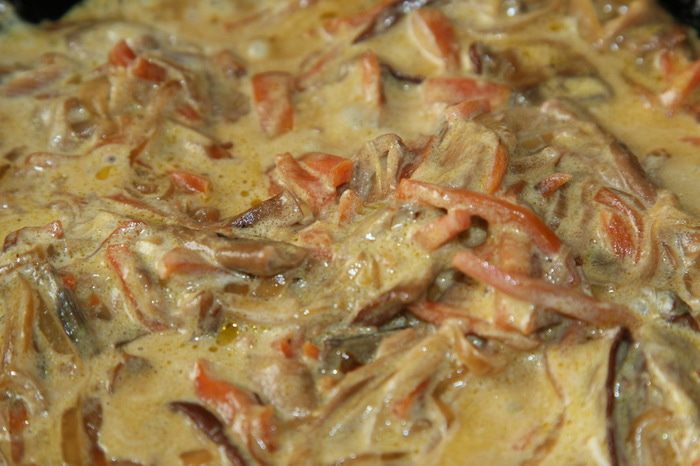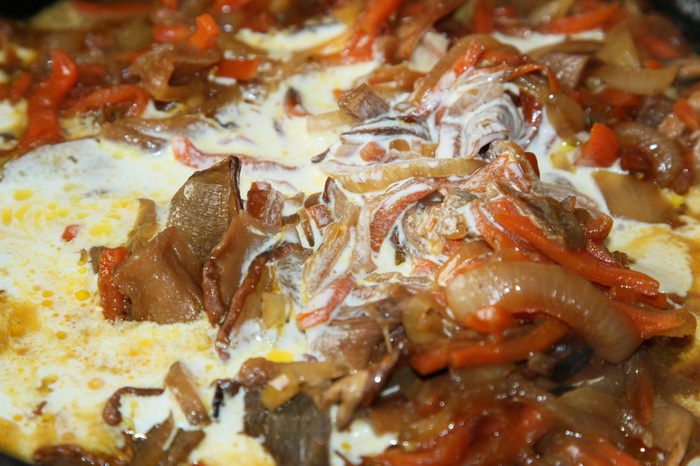 Отправляем грибы к моркови с луком и понемногу добавляем воду, в которой у нас были замочены грибочки. Протушиваем до выпаривания жидкости. Как только жидкость выпарилась, добавляем сливки.