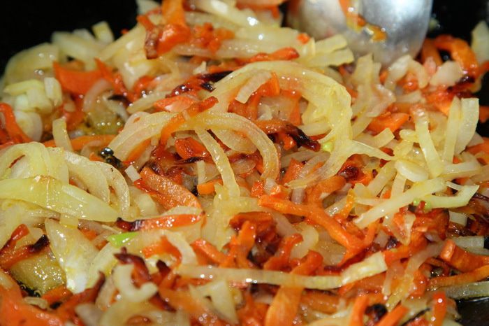 Пока готовится картофель, пассеруем на сковороде с небольшим количеством масла морковь. Как только морковь дала цвет, добавляем порезанный полукольцами лук.