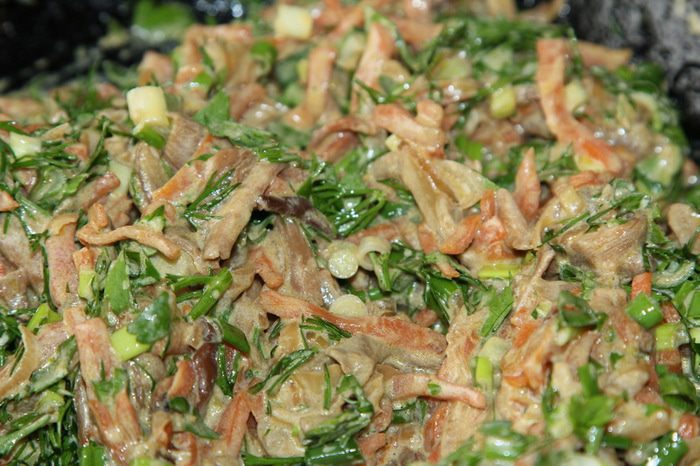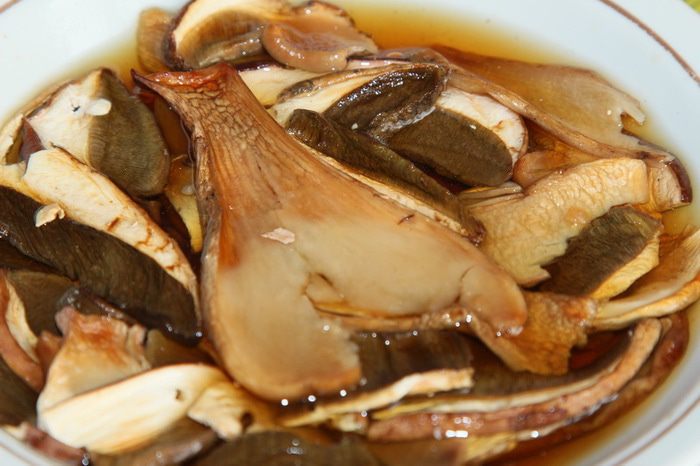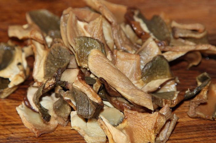 Грибы отжимаем, воду не выливаем, она нам пригодится. Грибы оставляем крупными кусочками.