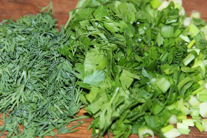 Нарезаем зелень, у меня зеленый лук, петрушка и укроп.