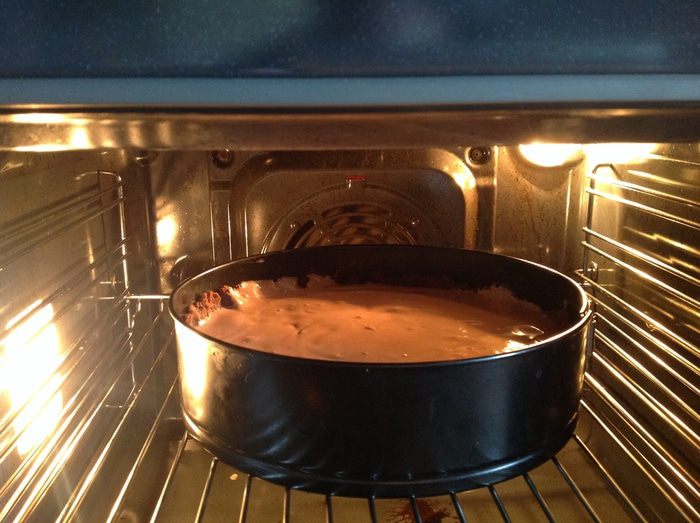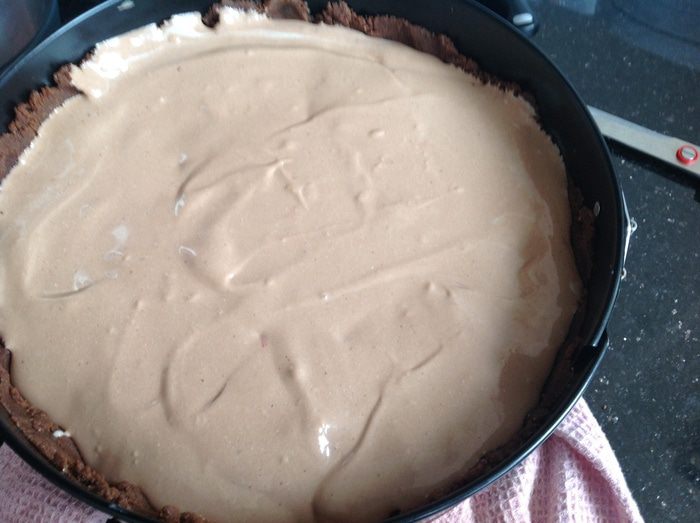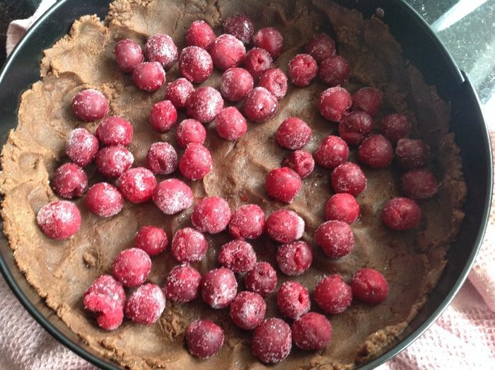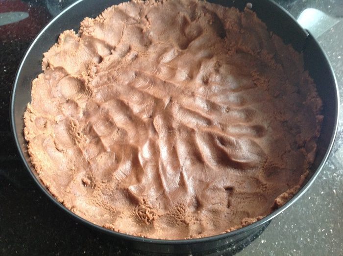 В разъемной форме для выпечки (диаметр 26 см) распределить тесто, края загнуть вверх на 2 см. Поставить в холодильник на 20 минут.