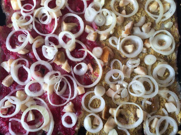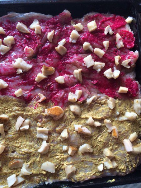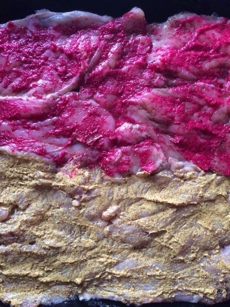 Смазываем мясо горчицей или хреном (можно чем-то одним по вкусу, но я решила попробовать оба ингредиента для сравнения).