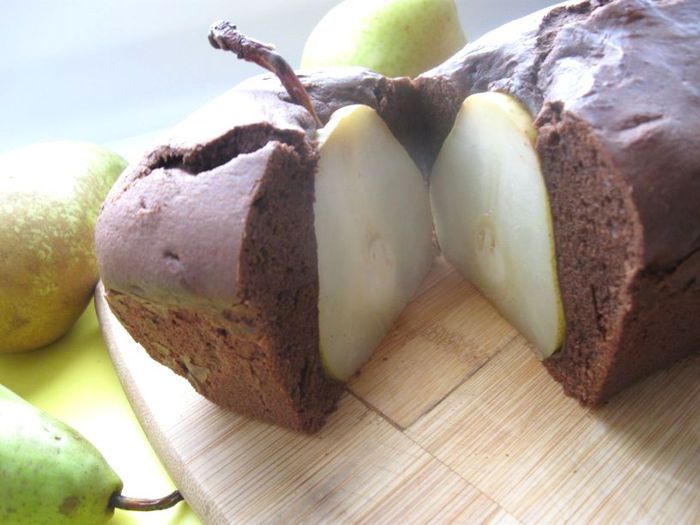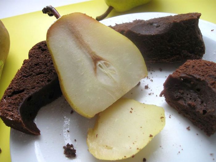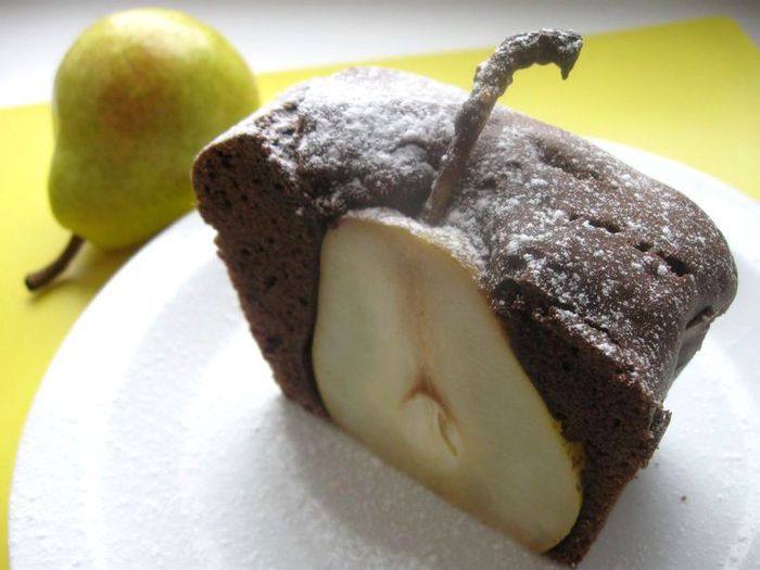 Выпечка для всех любителей шоколадного десерта. Шоколад - горький (75 % какао), вкус кекса умеренно сладкий, скорее пикантный за счет сочетания:порошок какао – ликер - груша – шоколад. Запеченные в шоколадном бисквите груши (сорт Вильямс), имеют кремовую, чуть мягковатую консистенцию и приятный аромат. Ликер желательно взять грушевый. Подают к чаю, кофе и на десерт. Вариант эффектной выпечки, которая, наверняка, понравится вам и вашим гостям.