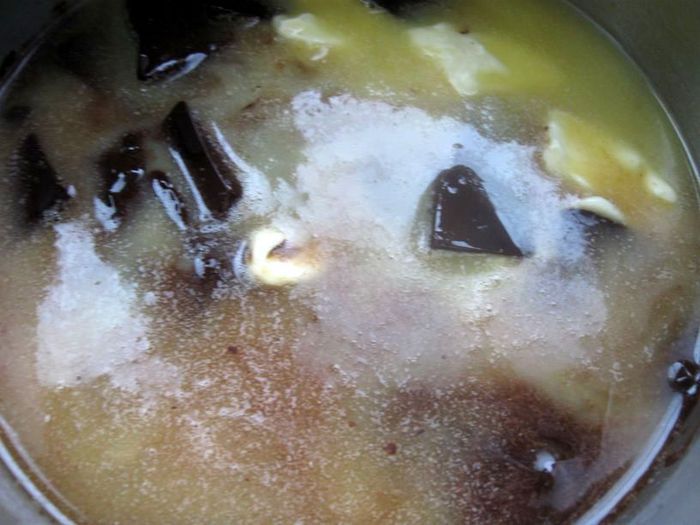 Растопить в сотейнике масло и добавить поломанный на кусочки шоколад.