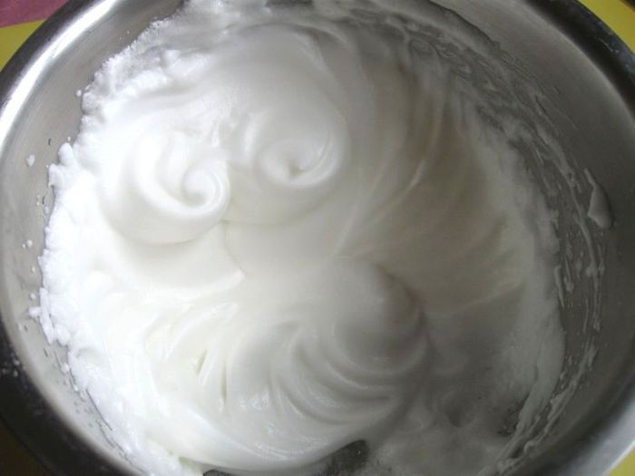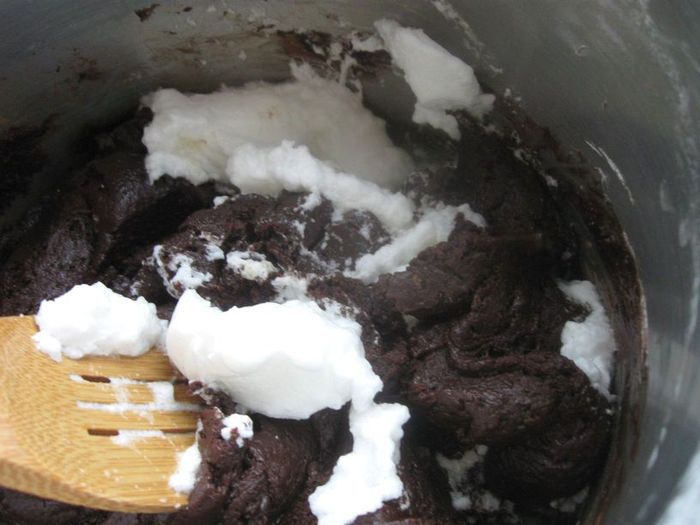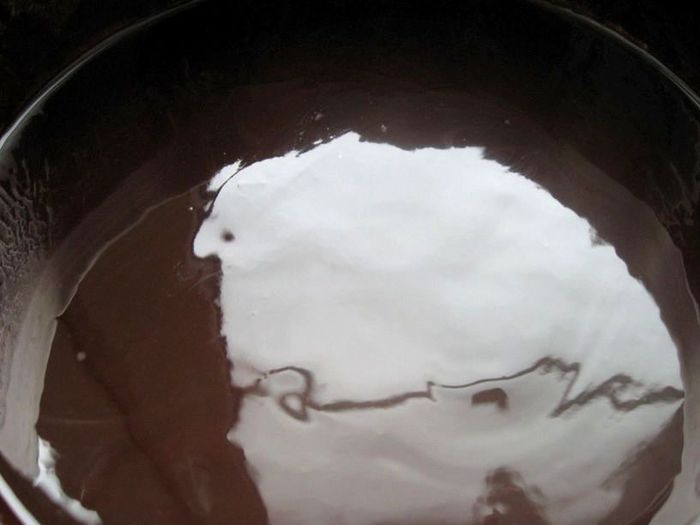 Аккуратно лопаточкой добавлять белки, поднимая лопаточкой их снизу вверх.