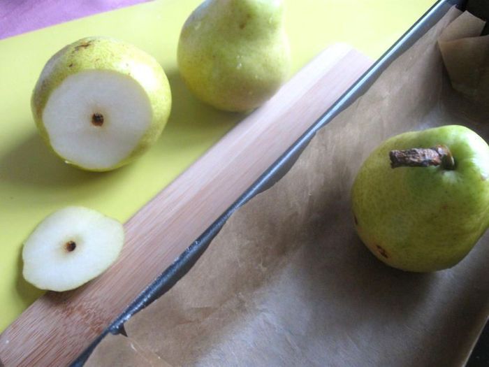 Груши помыть, срезать основание, чтобы они удобно расположились в форме. Прямоугольную форму застелить бумагой для выпечки. Поставить в форму груши на одинаковом расстоянии друг от друга. Хвостик у груш не отрезать.