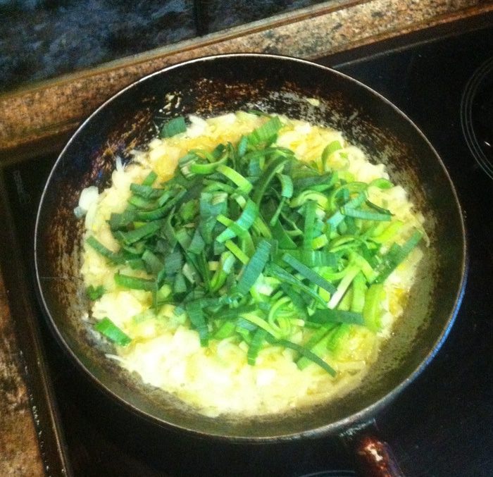 Растопить сливочное масло в глубокой сковороде. Обжарить нарубленный репчатый лук, лук-порей до мягкости.