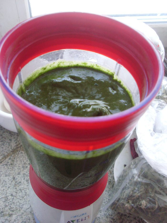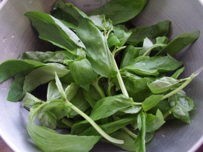 Помыть листики базилика. Сложить крапиву и базилик в блендер и налить оливкового масла первого отжима и взбить.