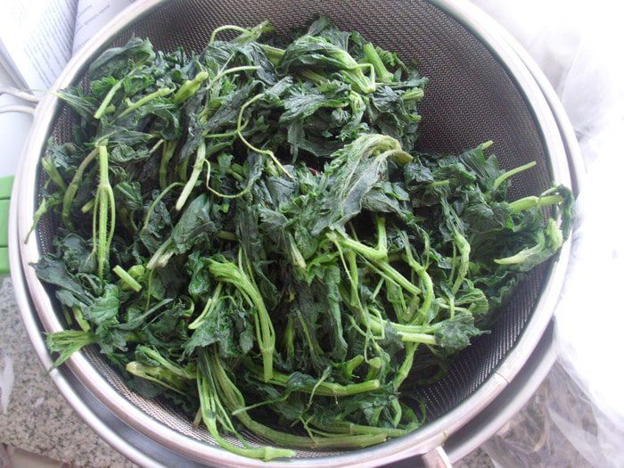 Отварить крапиву, сложив в кипящую воду и доведя до кипения. Откинуть на дуршлаг и дать немного остыть. Для песто понадобится 160 грамм отварной крапивы.