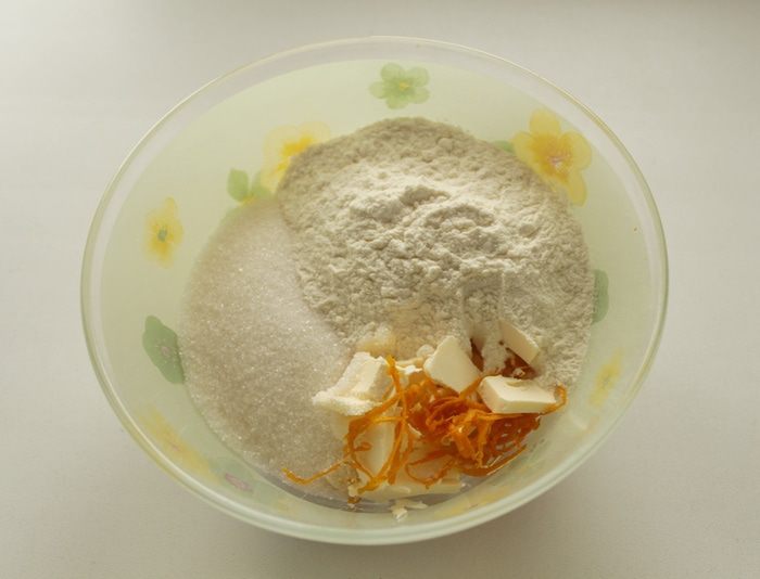Для штрейзеля смешать муку, соль, сахар и масло. Добавить апельсиновую (или лимонную) цедру и сок.
