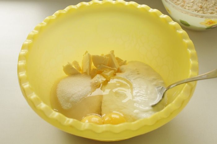 Для теста: смешать йогурт, сахар, яйца и масло, слегка взбить.
