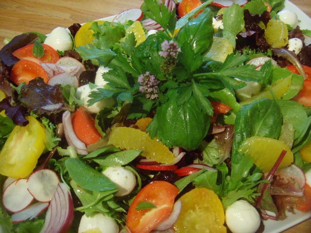 В комментарии к рецепту уже описан процесс приготовления салата, поэтому я сегодня без пошаговых. Остаётся добавить, что в списке не нашлось салатного микса, который у меня состоит из молодого шпината, корна, молоденьких побегов буряка и т.д. Так же список не выдал помидорки черри красные, которые отлично контрастируют в салате с остальными овощами. И ещё, когда будете филетировать апельсин, собирайте сок, который потом войдёт в состав салатного соуса.