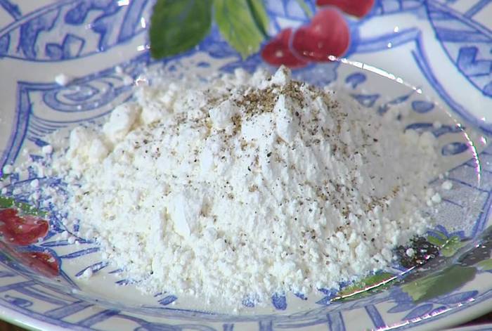 Муку перемешать со щепоткой соли и черного перца.
