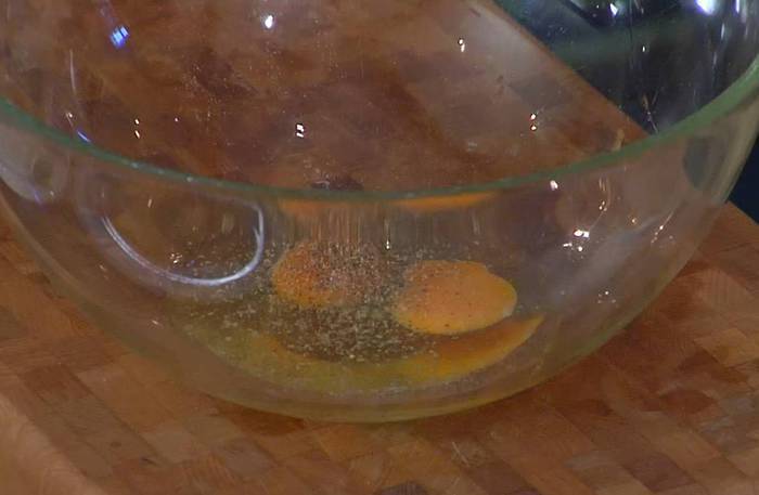 Яйца посолить, поперчить и взболтать вилкой.