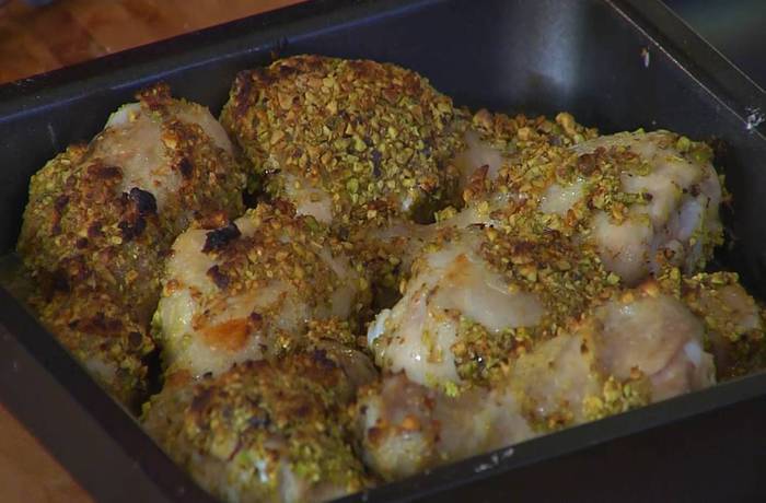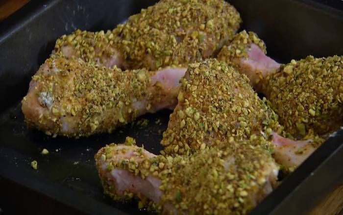Куриные ножки вымыть, высушить, обвалять в муке и окунуть во взбитое яйцо, затем обвалять в измельченных фисташках и выложить в небольшой, глубокий противень, смазанный оливковым маслом.