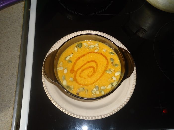 Готовый суп наливаем в тарелку, украшаем семенами тыквы чищенными и поливаем кунжутным маслом и подаем.