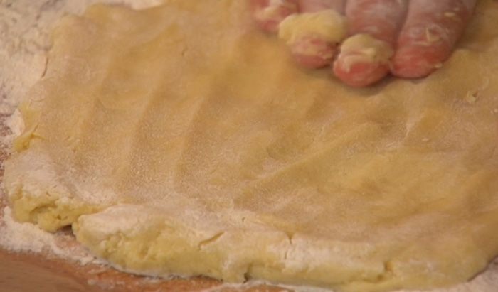Вторую половину теста поместить на рабочую поверхность, присыпанную оставшейся мукой, и раскатать.