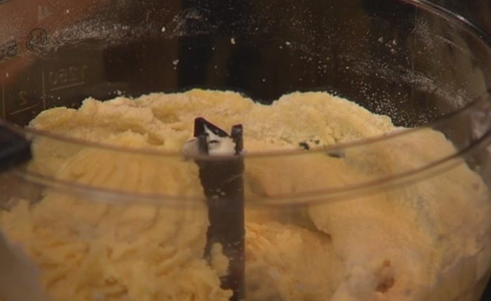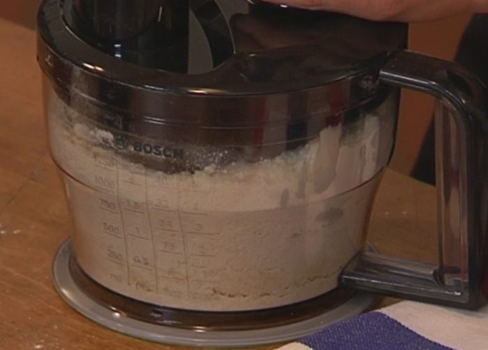 В чаше блендера соединить 300 г муки, сахар, 140 г предварительно размягченного сливочного масла, разрыхлитель, соль и измельчить все в крошку.