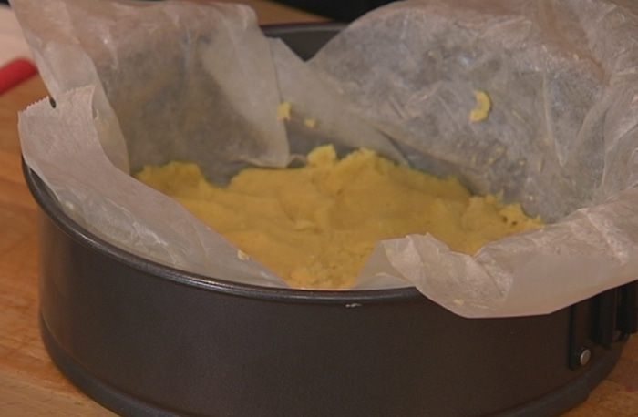 Разъемную форму для выпечки выстелить пищевой бумагой, смазать ее оставшимся сливочным маслом, выложить чуть больше половины теста и сформировать корж толщиной в 1 см.