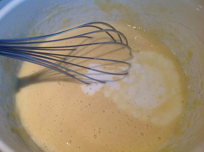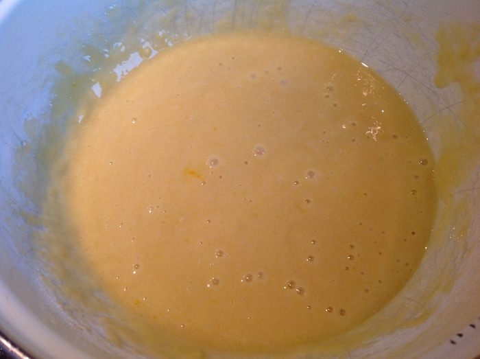 Вливая тонкой струйкой молоко, перемешать до получения однородного теста.