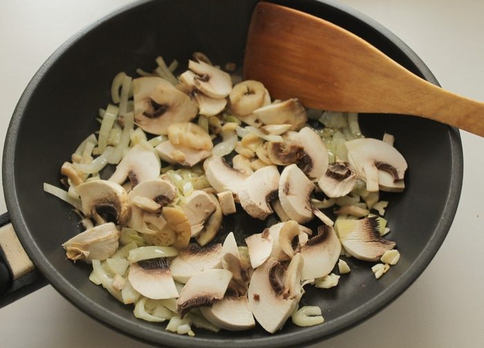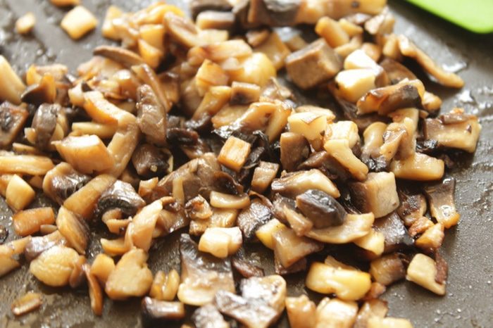 Оставшуюся половину грибов мелко порезать и обжарить.