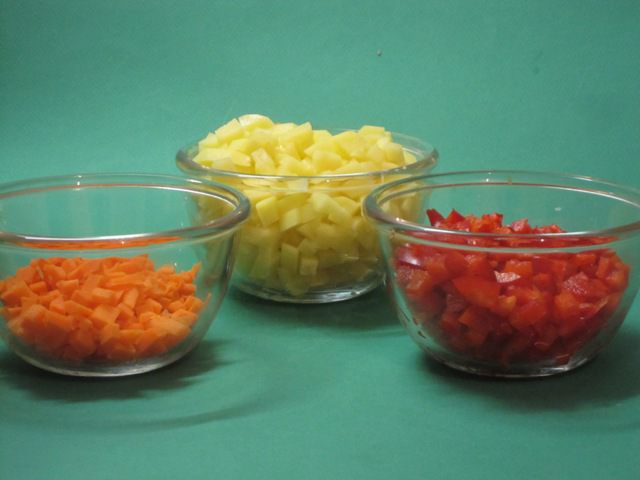Пока варятся фрикадельки, надо подготовить овощи. Морковь, картофель и сладкий перец нарезать кубиками.