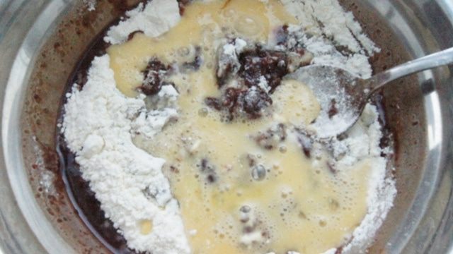 В теплую шоколадную смесь добавить муку, разрыхлитель и слегка взбитые яйца. Перемешать, чтобы не было комочков.