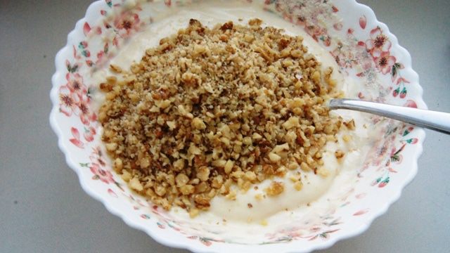 Для орехового слоя смешать яйца, сметану и сахар. Добавить муку и измельченные орехи. Перемешать.