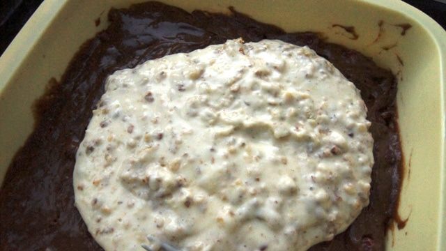 Нижним слоем выкладываем шоколадно-брусничное тесто, а сверху разровнять ореховое. Выпекать в разогретой до 180°С духовке 35-40 минут.