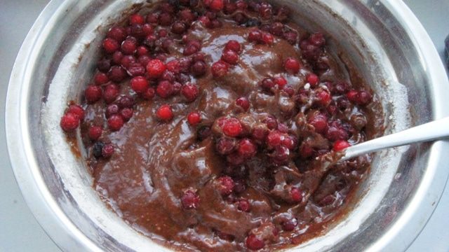 Добавить ягоду. Можно взять любую — и свежую, и замороженную,и бруснику и смородину, и вообще, какую вы любите. Но предварительно лучше разморозить ягоду, иначе шоколадная смесь сразу схватывается.
