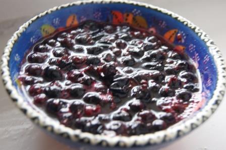 Приготовить соус. Замороженную ягоду добавить в кипящую воду, слить в сито, залить холодной водой. Воду слить. Ягоду выложить в кастрюльку, прогреть.