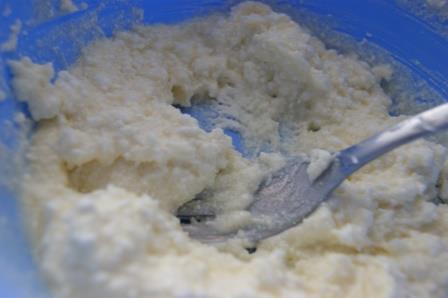 Яйца разделить на желтки и белки. Желтки растереть с сахаром и творогом.