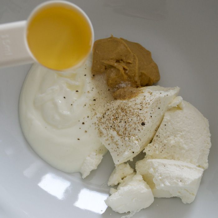 Для соуса положить сыр рикотта, сметану, горчицу (по рецепту - неострая), уксус, сахар, соль и перец в салатницу.