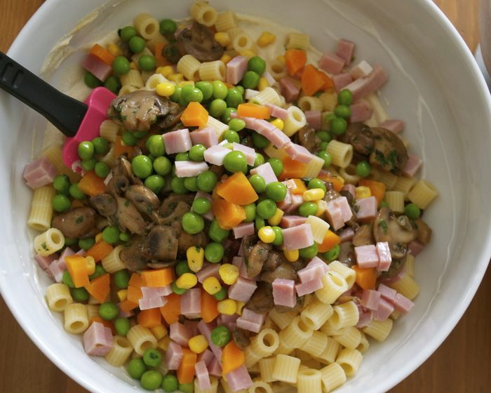 Выложить в салатницу макаронно-овощную смесь с грибами и ветчиной. Хорошо все перемешать.
