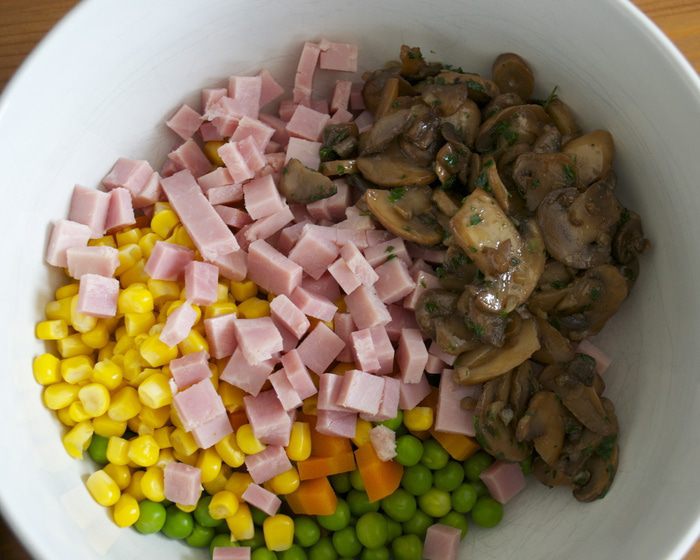Ветчину нарезать мелким кубиком. Добавить к овощной смеси.