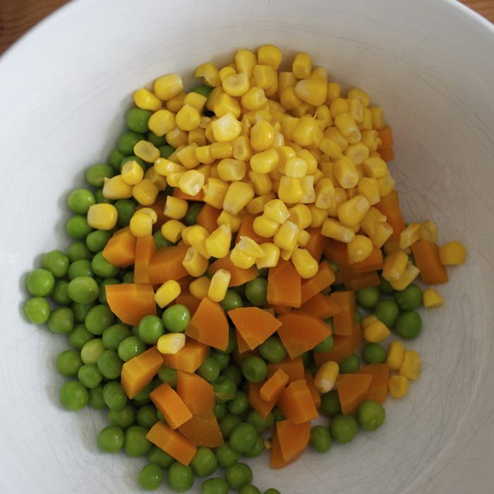 В рецепте предлагается взять замороженную смесь с горошком, морковью и кукурузой и отварить овощи (200 г). У нас такой смеси не продают. Поэтому я нарезала мелко морковь и отварила ее вместе с замороженным горошком. К готовым овощам добавила консервированный горошек.