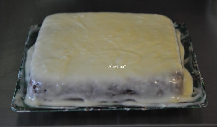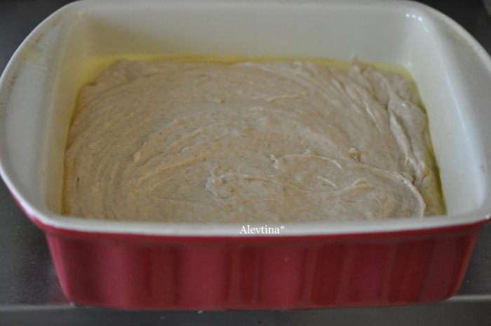 Вылить в большую смазанную форму прямоугольную или квадратную. Поставить в духовку на 25 мин. Проверяем центр зубочисткой. Дадим остыть кексу полностью.